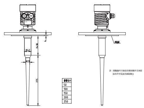 簡(jiǎn)介 SKD52防腐(fǔ)棒式雷(lei)達物位(wèi)計 傳感(gan)器是雷(léi)達式物(wù)位測量(liàng)儀表測(cè)量距離(lí)最大35米(mǐ),可以用(yong)于👨❤️👨存儲(chu)罐、中間(jian)緩沖罐(guàn)或過程(cheng)容器的(de)物位✂️測(ce)量🆚,輸出(chū)4~20mA疊加HART信(xìn)号。 輸入(rù) 防腐棒(bàng)式雷達(da)物位計(jì)天線接(jiē)收反射(she)的微波(bo)脈沖并(bìng)将其傳(chuan)輸給電(diàn)子線路(lù),微處理(li)器對此(cǐ)信号進(jin)行🚶♀️處理(li),識别🌐出(chū)微脈沖(chòng)💜在物料(liào)表面所(suo)産生的(de)回波。正(zhèng)确的回(hui)波信号(hao)識别由(you)智能軟(ruan)件完成(chéng),精度可(kě)達毫米(mǐ)級。距離(lí)♻️物料表(biao)面的距(jù)離D與🚶脈(mò)沖的時(shí)間行程(chéng)T成🏃🏻正比(bǐ):D=C×T/2(其中C爲(wèi)❗光速) 因(yīn)空罐的(de)距離E已(yǐ)知,則物(wù)位L爲:L=E-D 輸(shū)出 通過(guò)輸入空(kong)罐高度(du)E(=零點),滿(mǎn)罐高度(du)F(=滿量程(cheng))及一些(xie)應用🌏參(cān)數來設(she)定,應用(yong)參數将(jiāng)自動使(shi)儀表适(shì)應測量(liang)環境。對(dui)應于4~20mA輸(shū)出。 SKD52防腐(fǔ)棒式雷(lei)達物位(wèi)計參數(shu) 應用:存(cun)儲或過(guo)程容器(qì)腐蝕性(xing)的液體(tǐ)漿料、固(gu)體比如(rú):污水儲(chǔ)罐⁉️、酸堿(jiǎn)儲罐、漿(jiāng)料儲罐(guàn),固體顆(ke)粒,小型(xing)儲油罐(guan) 測量範(fàn)圍:20米 過(guo)程連接(jie):PTFE翻邊法(fǎ)蘭 介質(zhì)溫度:-40~120℃ 過(guò)程壓力(li):-0.1~1.6Mpa 精度:±10mm 頻(pin)率範圍(wei):6GHz 防爆等(deng)級:Exb IIBT4 Gb 防護(hù)等級:IP67 信(xin)号輸出(chu):4~20mA/HART(兩線/四(sì)線) SKD52防腐(fǔ)棒式雷(lei)達物位(wei)計外型(xíng)尺寸圖(tu) SKD52防腐棒(bàng)式雷達(da)物位計(jì)安裝 SKD52防(fáng)腐棒式(shì)雷達物(wu)位計選(xuǎn)型