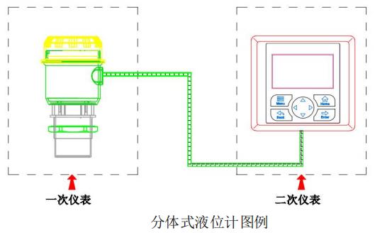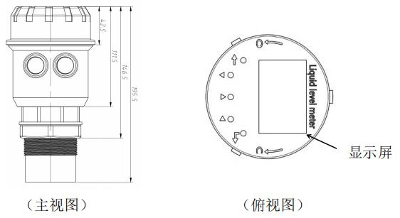 分體式(shì)由顯示(shì)儀表(二(èr)次儀表(biǎo))和超聲(shēng)波傳感(gǎn)器(一次(cì)✍️表📧)兩部(bu)🛀分組成(chéng),結構如(rú)下(外觀(guān)尺寸見(jian)6.1.1):