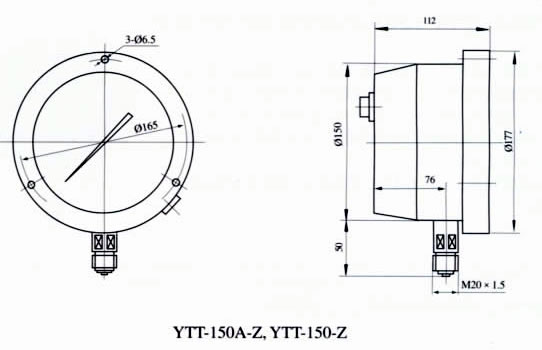 YTT-150A 、YTT-150A-Z型(xing)儀表供電電(dian)源:220V;50Hz。YTT-150、YTT-150-Z型供電電(dian)源:24VDC由配電器(qi)供電。 儀表工(gōng)作溫度:-25℃~55℃,相對(duì)濕度不超過(guò)80%。耐震型儀表(biao)工作環境振(zhen)動頻率不大(dà)于25Hz,振幅不大(da)于0.3mm。 儀表執行(hang)标準:Q/320211 DGH03-2003 外形尺(chi)寸: